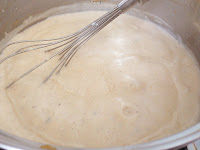 Add in one cup of milk. Whisk whisk! It's got to be cold milk to ensure a smooth sauce free of lumps. Add in the remaining two cups of milk and whisk some more while bringing to a simmer.